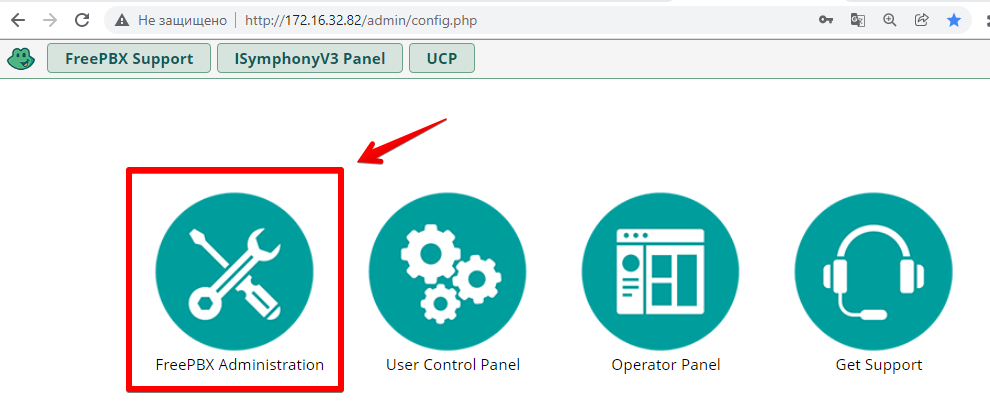 Перейдите в веб-интерфейс АТС, выберите раздел FreePBX Administration.